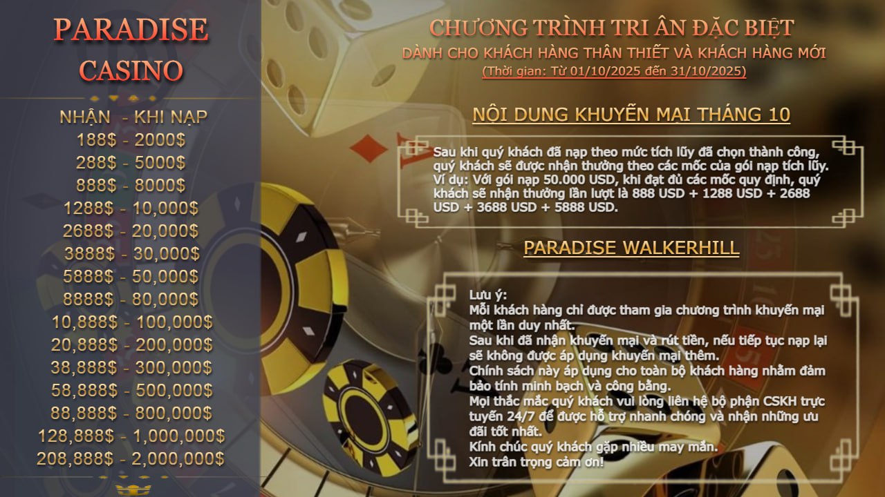 THÔNG BÁO : Số tài khoản ngân hàng trên nền tảng có thể thay đổi bất cứ lúc nào. Để đảm bảo giao dịch nạp tiền được chính xác và an toàn, quý khách vui lòng liên hệ bộ phận CSKH trực tuyến để xác nhận số tài khoản nhận trước mỗi lần chuyển khoản. Rất mong quý khách thông cảm và hợp tác! Chúc quý khách luôn hạnh phúc và gặt hái nhiều thành công!Trân trọng, [Paradise Casino Walkerhill]
